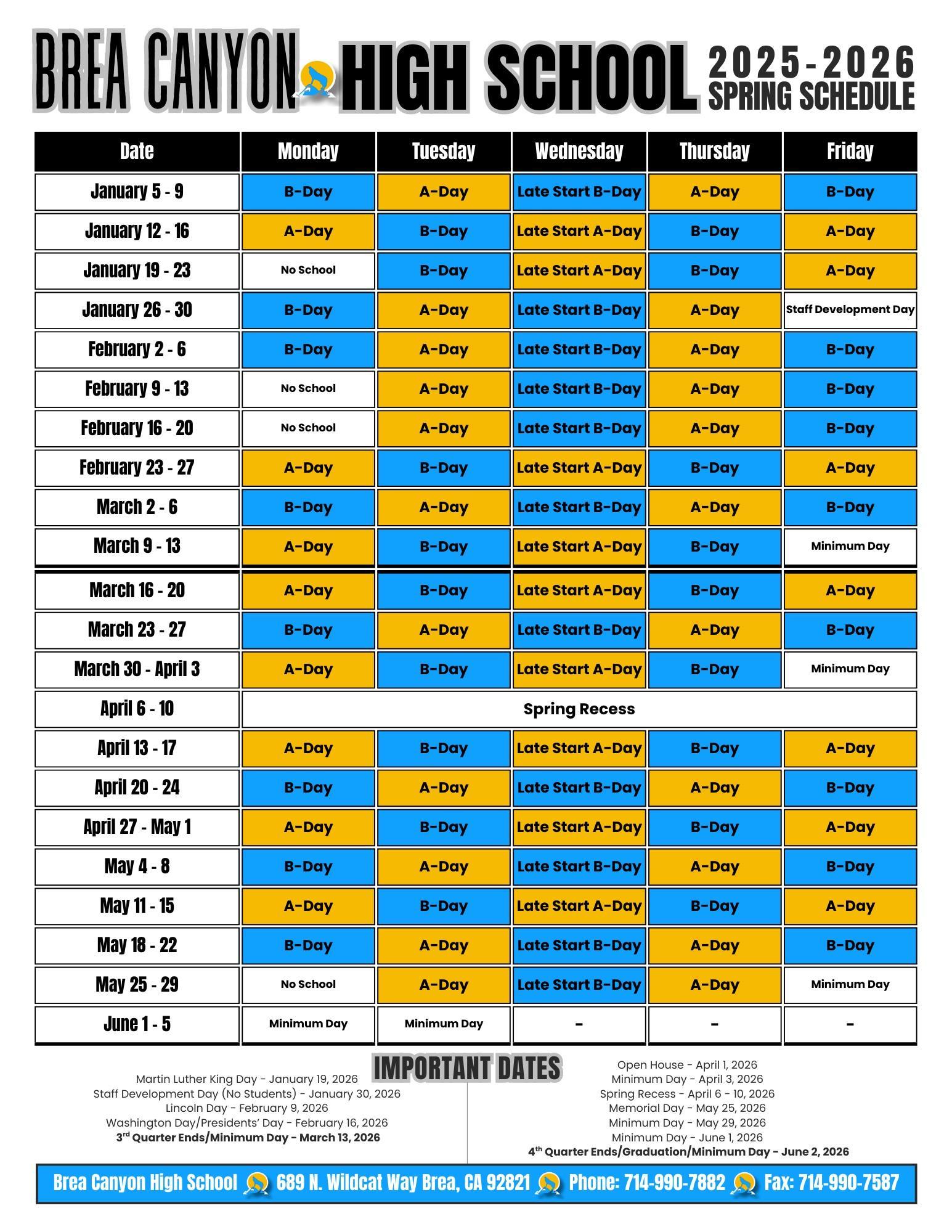 Students will alternate between A-DAYS, (1, 3, 5), and B-DAYS, (2, 4, 6) periods - Monday, Tuesday, Thursday and Friday. All Wednesdays are a Late start (Starting at 9:30 AM). All minimum day schedules will have Periods 1-6. Please refer to the 25 - 26 SPRING SEMESTER SCHEDULE for a more detailed breakdown of our block period scheduling for the year.